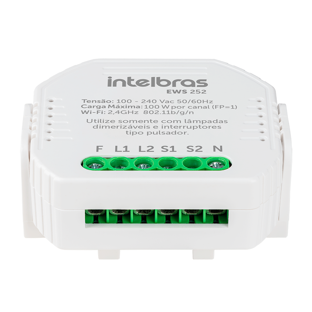 - Conexao eletrica: Fase (F), Neutro (N), Carga 1 (L1), Interruptor 1 (S1), Carga 2 (L2), Interruptor 2 (S2) (as cargas devem ser lampadas dimerizaveis, os interruptores devem ser do tipo pulsador)