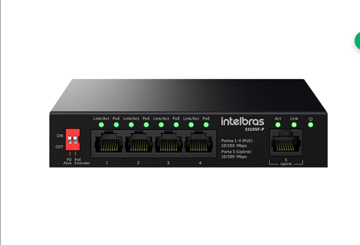Conta com 5 portas Fast Ethernet, sendo 4 delas com suporte à função PoE e 1 exclusiva para uplink.